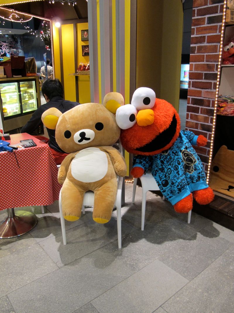 Super cute soft toy christmas tree on the left, hugeass Rilakuma and Elmo soft toys on the right.